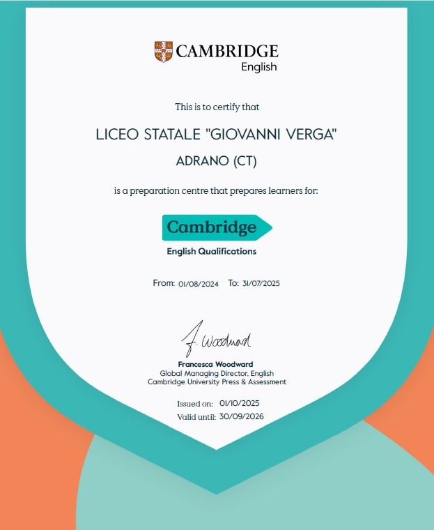 Il liceo Verga è nuovamente riconosciuto come centro di preparazione ufficiale agli esami di Cambridge English. Quest'anno, vogliamo sottolineare la dedizione e la professionalità dei nostri docenti, come testimonia la lettera di ringraziamento e congratulazioni inviata dalla Cambridge University alla docente Referente per le certificazioni Cambridge.