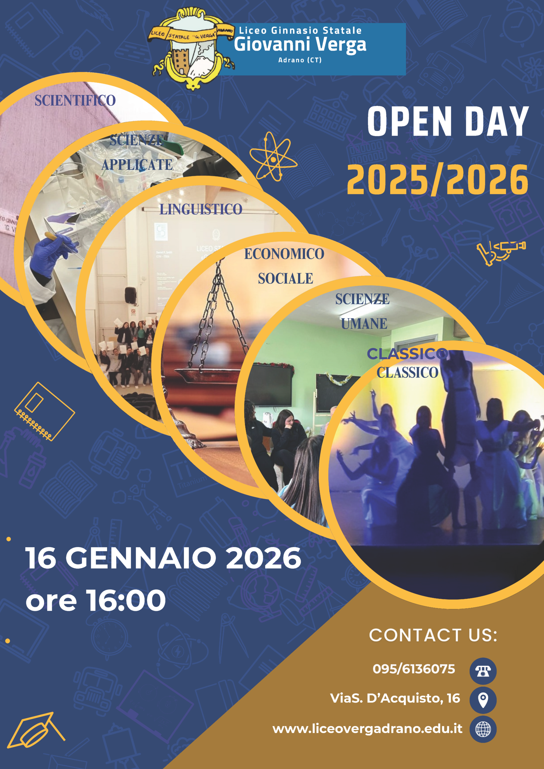 Anche per quest'Anno Scolastico, il Liceo Verga organizza un evento di Open Day aperto a tutti gli alunni delle classi terze delle Scuole Secondarie di Primo Grado. La giornata prevista per il nostro "Open Day 2026" è il 16 gennaio 2026: dalle ore 16.00 in poi potrete visitare la scuola e partecipare alle iniziative che sono state preparate per voi!