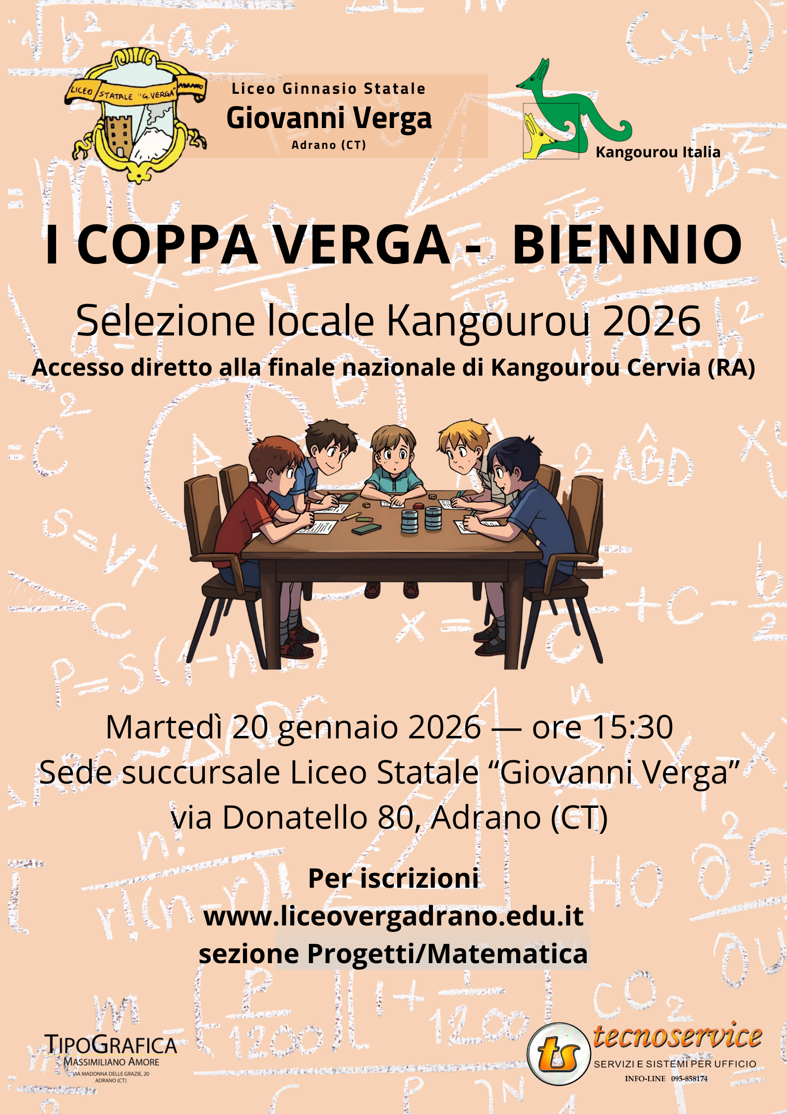 Martedì 20 gennaio 2026, alle ore 15:30, presso la sede succursale del Liceo Verga, in Via Donatello, 80 ad Adrano, all'interno delle attività legate alle Gare Nazionali di Matematica, si terrà la Prima Coppa Verga - Biennio, che vedrà le squadre delle Scuole Secondarie di Secondo grado partecipanti, scontrarsi per la partecipazione alla gara nazionale Kangourou di Cervia. Il Torneo, infatti, rappresenta la selezione locale per il Kangourou 2026. È la prima volta che il nostro Liceo ospita un evento nazionale così importante per le Gare di Matematica e siamo certi che i partecipanti tutti saranno messi nelle condizioni di dare il meglio della loro preparazione.